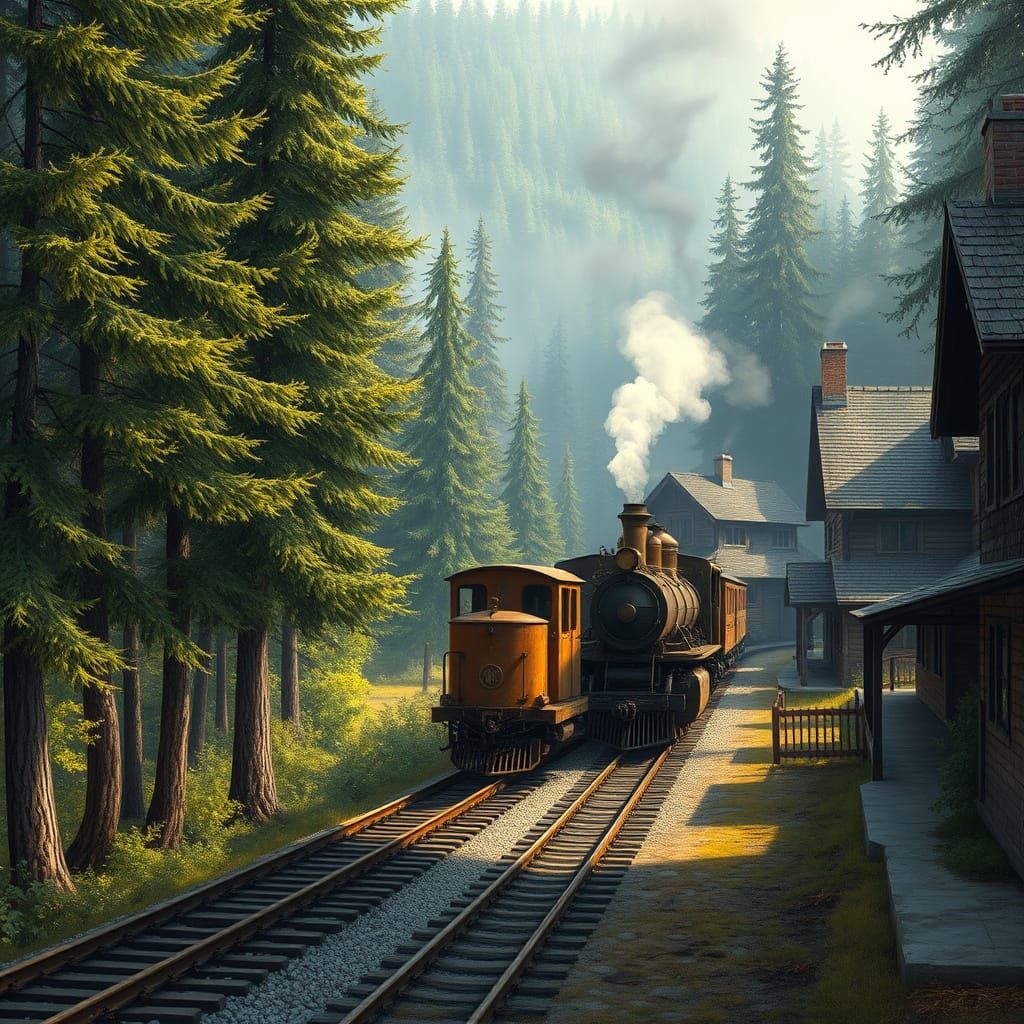This enchanting image shows a vintage steam train winding its way through a misty forest, surrounded by towering trees and quaint, old town buildings, evoking a sense of nostalgia in a romantic, dreamy landscape style.