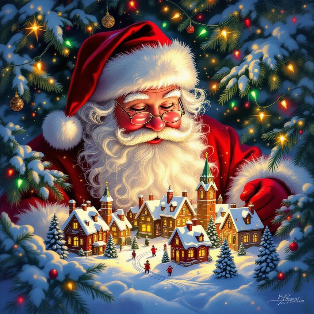 This enchanting digital painting shows Santa Claus marveling at a tiny, glowing city hidden within a Christmas tree. Festive lights create a magical atmosphere.