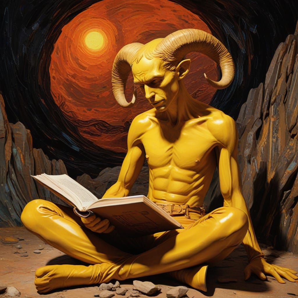 This image depicts a whimsical and beautiful fauvist style scene of a mini dark elf sitting in a cave, surrounded by warm golden lighting and soft shadows. The artwork features thick brushstrokes, impasto texture, and bold colors, with muted earthy tones and pops of bright yellow and orange.
