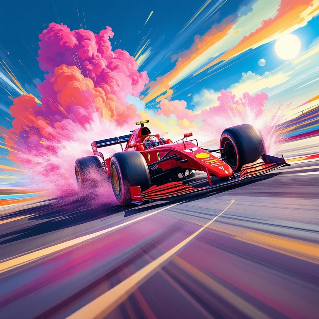 A dynamic image of a Ferrari racing car on a sunny track, captured with bold lines, geometric shapes, and energetic brushstrokes, evoking a futuristic digital painting.