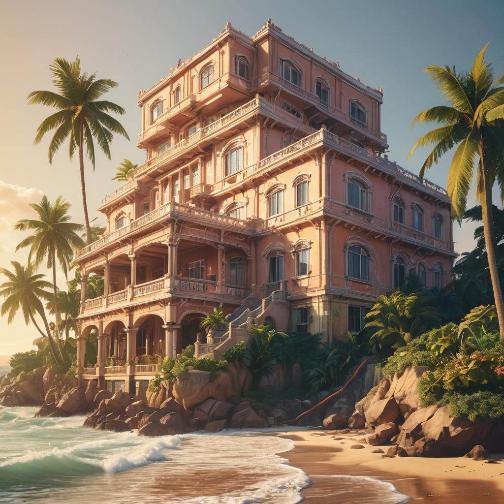 A vibrant pixel art image of a luxurious building on an exotic shore. The cartoonish, oversaturated style features rich textures, intricate details, and soft, warm light with a golden hour glow.