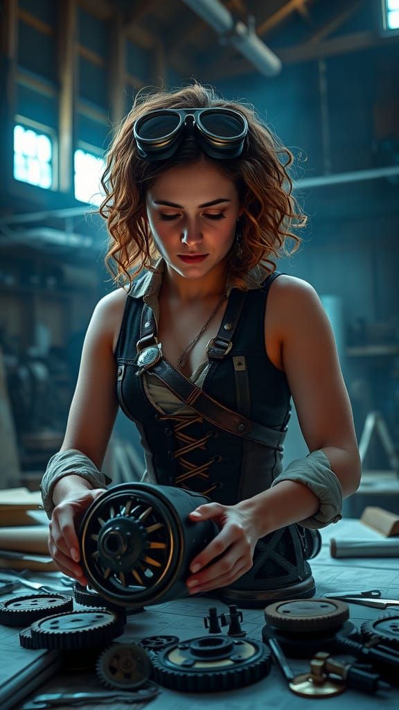 This image captures a moment of intense focus from a brilliant inventoress surrounded by blueprints, gears, and tools in a dimly lit workshop, showcasing a cinematic aesthetic with warm lighting and subtle lens flares.