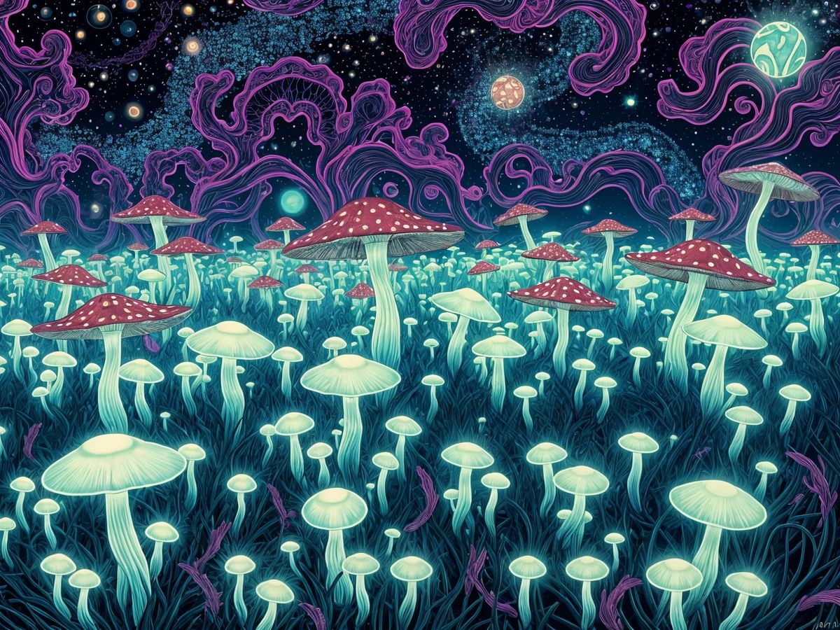 This image showcases a sprawling field of glowing mushrooms with an otherworldly aura, rendered in a detailed Art Nouveau aesthetic with soft lighting and complementary colors.