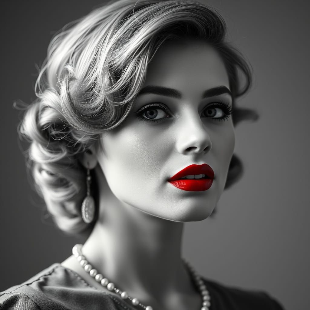This image shows a vintage woman reminiscent of classic Hollywood portraits. Her makeup is meticulously applied, and the monochrome backdrop emphasizes her red lips and vintage fashion.