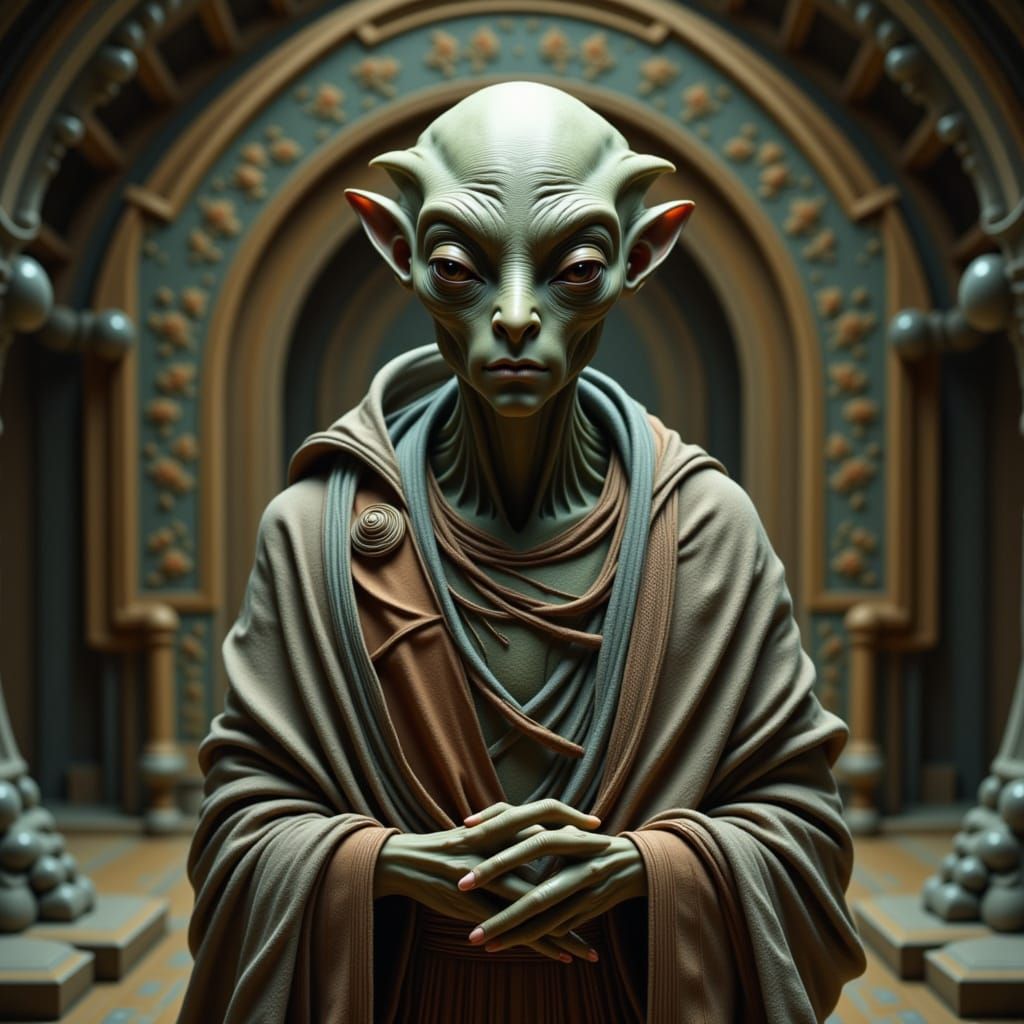 This image features a wise, ancient alien elder with a prominent cranial ridge and large forehead, embodying peaceful wisdom. He wears intricate ritualistic robes in a serene alien temple setting.