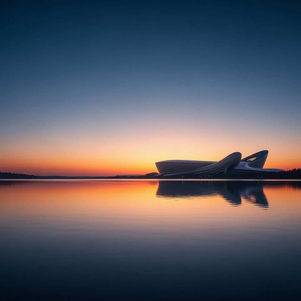 A tranquil sunset scene over a vast lake showing a distant stadium. This image shows a blend of Romanticism and color field aesthetics. The stadium architecture features organic, flowing lines.