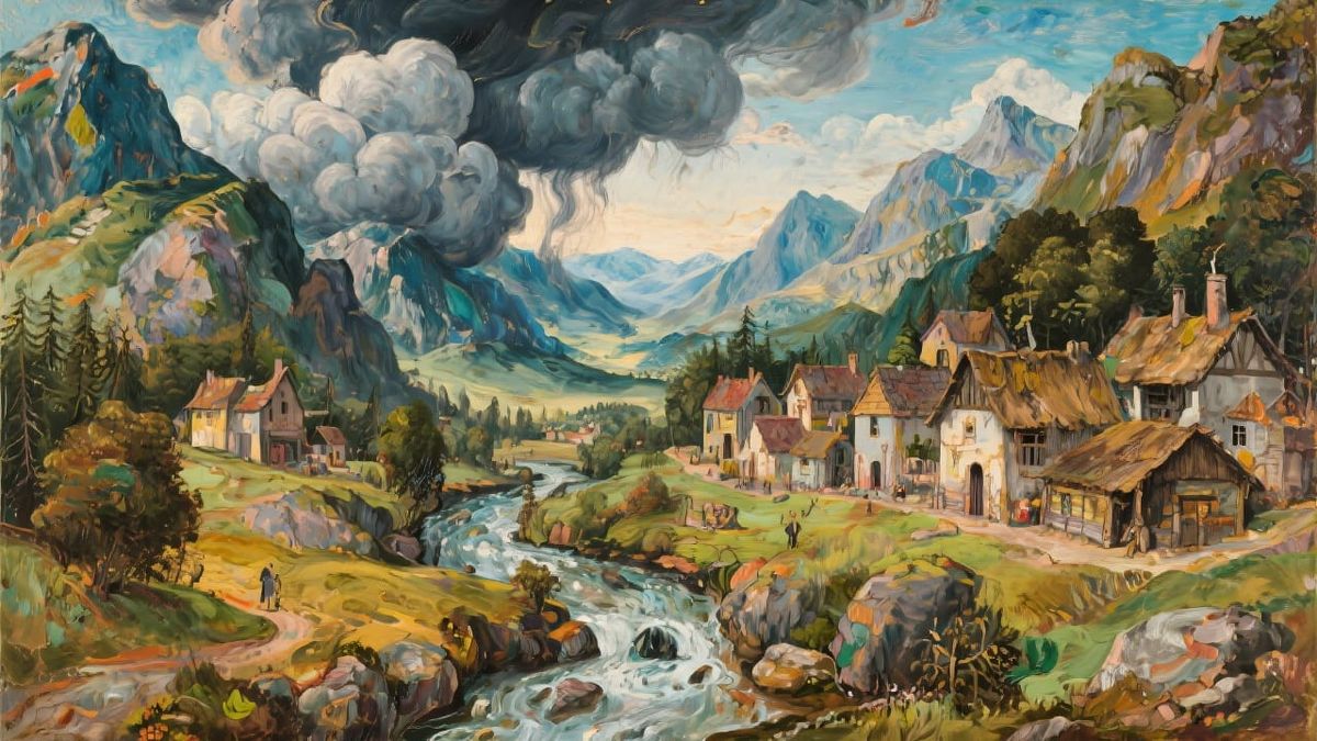 This image shows a rustic mountain town in a valley. Majestic clouds surround the town, and a mountain stream flows through it as storm clouds gather, in a vibrant, painterly style.