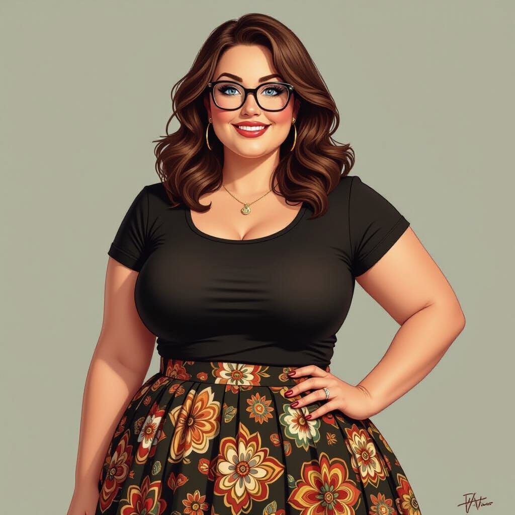 This image shows a happy, plump woman with brown hair and glasses, wearing a black t-shirt and paisley skirt. The art style features vibrant colors and whimsical character designs, reminiscent of modern portraiture.