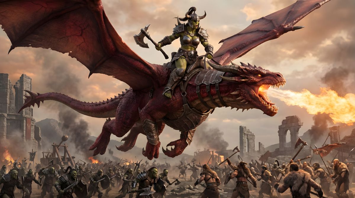 Generate epic fantasy battles with Orcs and Barbarians, featuring dragon riders. Free and easy AI image creation!