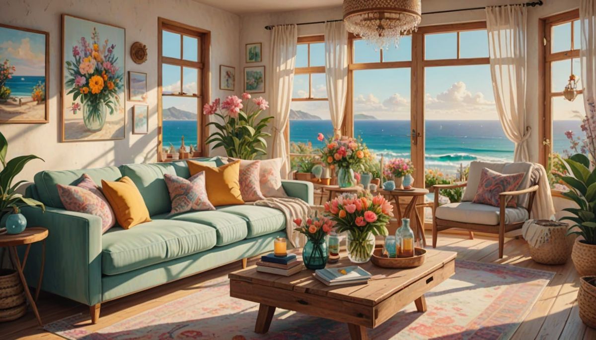 A bright and inviting living room filled with flowers and bohemian decor. The oil painting style gives the room a warm and cozy atmosphere, enhanced by soft sunlight and pastel colors.