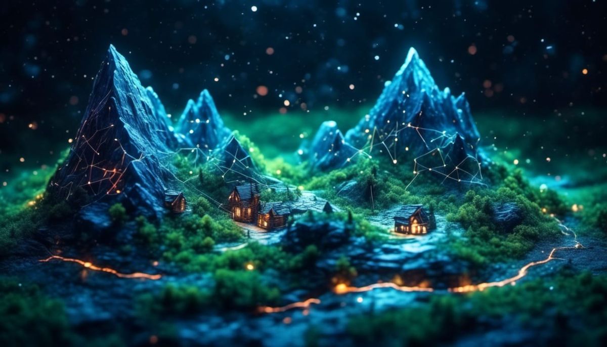 A digital visualization of an entity relationship model using abstract shapes and glowing lines. The artwork features floating text and a background that fades from bright green to dark blue.