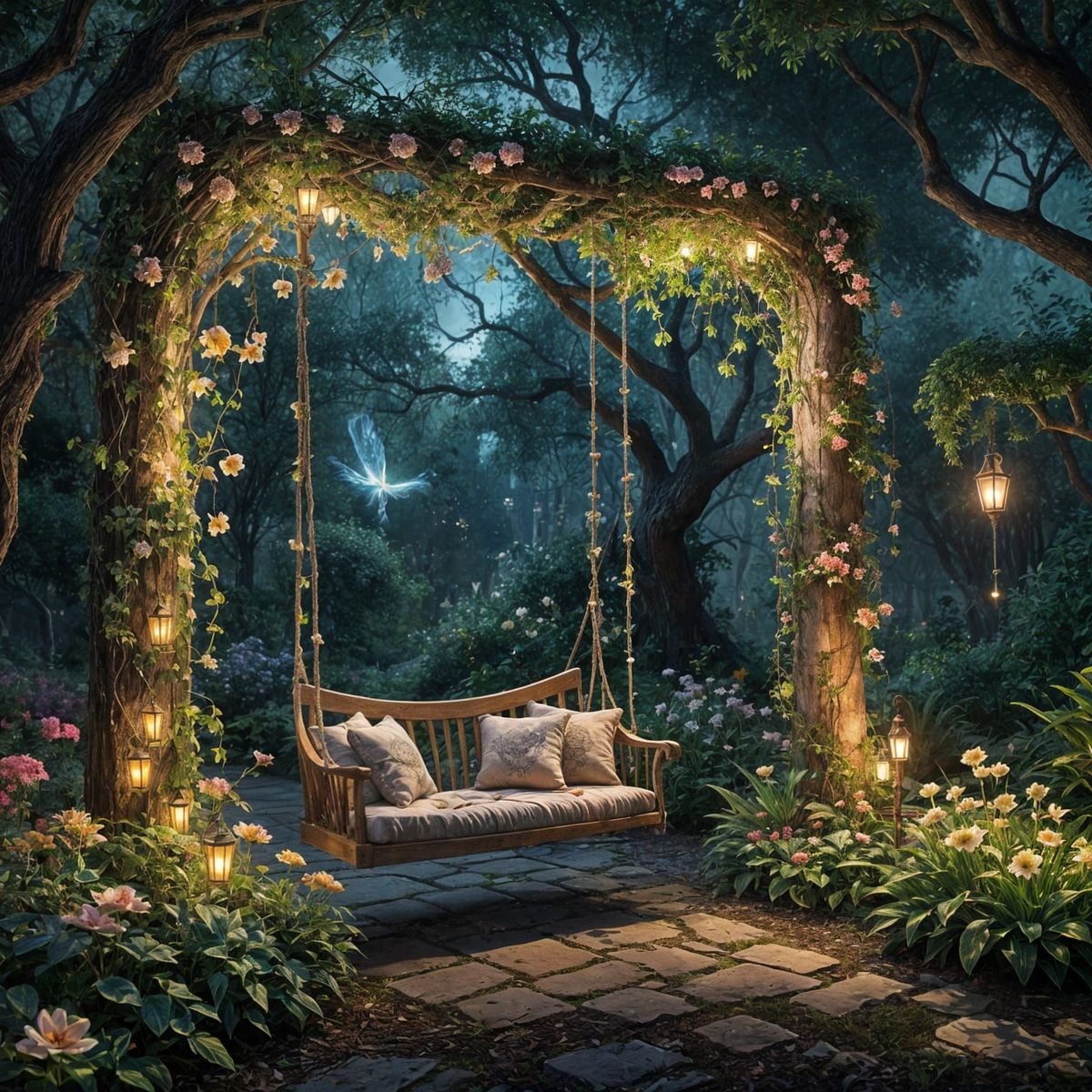This hyperrealistic image captures a mystical garden at night, featuring softly glowing flowers, vine archways, and a cushioned swing. The concept art style uses dramatic lighting and intricate details.