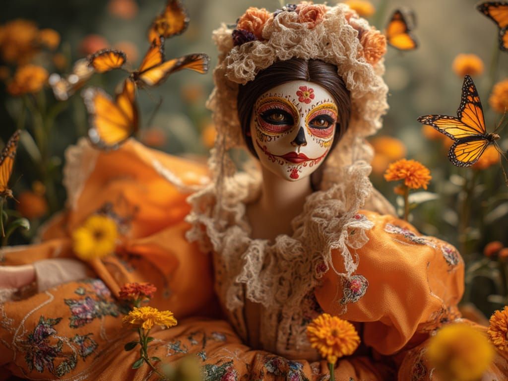 This image shows a woman with vibrant Dia de Los Muertos makeup, decorated with flowers and intricate patterns. She is surrounded by monarch butterflies in a softly lit fantasy scene.