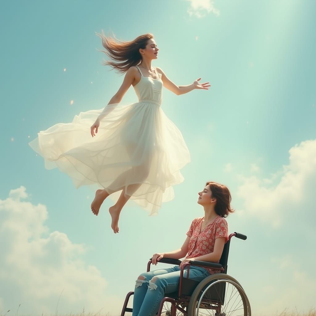 This image shows a young woman ascending into the sky bathed in light. Below, another woman sits in a wheelchair. The artwork has elements of digital painting with subtle textures.