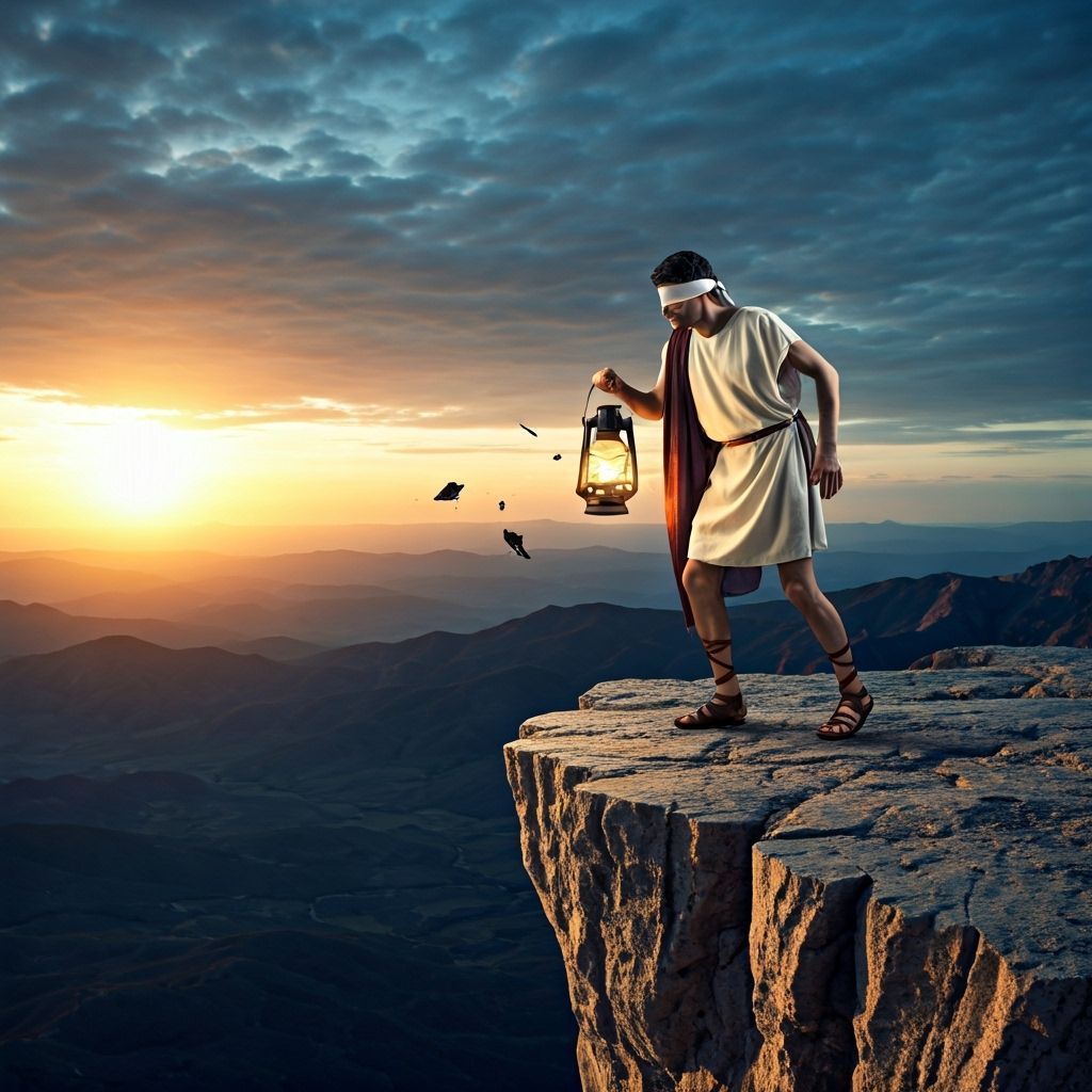 This photorealistic image shows a blindfolded man in ancient Greek attire carrying a broken lantern, stumbling towards a dangerous precipice. The scene depicts a sense of impending doom.