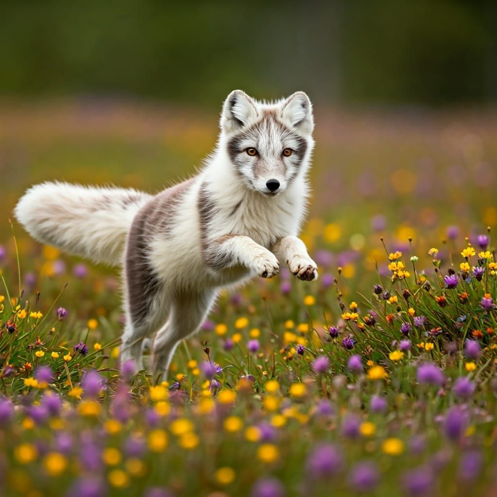This image shows an arctic fox jumping through a field of wildflowers. The vibrant colors and shallow depth of field create a dreamy bokeh effect, reminiscent of wildlife photography.