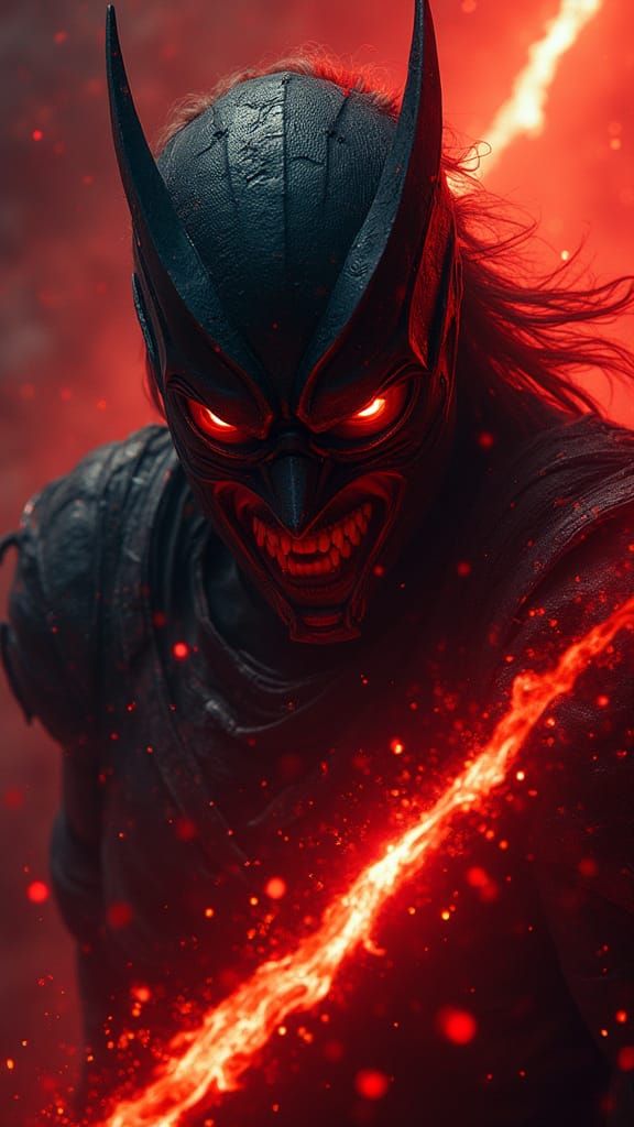 This image shows a masked warrior charging through a red storm, with glowing claws. A tilt-shift effect provides a 3D feel, drawing focus to the subject.