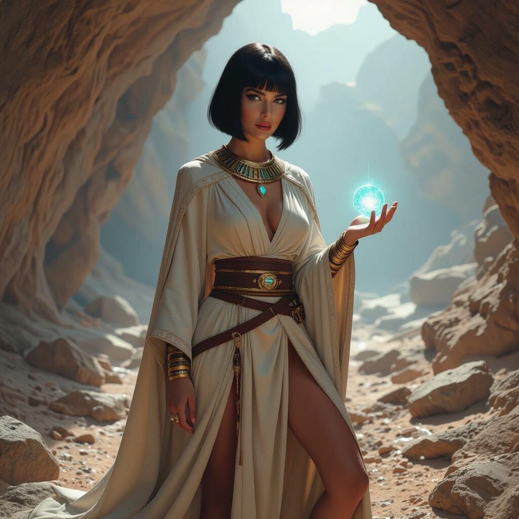 This image features Loxy Isadora Bliss with a sharp bob, styled in an Egyptian fashion. She wears a postmodern Jedi priestess robe while searching for gems in a cave.