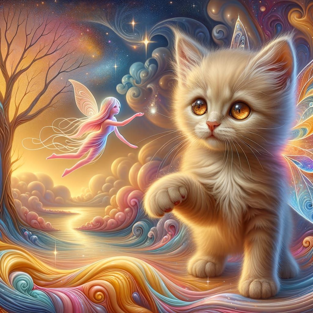 An image of a light tan kitten with glistening amber eyes, intricately textured fur, and delicate whiskers. The kitten stands on its hind legs, reaching out towards a small pastel pink fairy with iridescent wings and a mischievous grin. Both of the characters are set within a landscape of surreal flowing ...