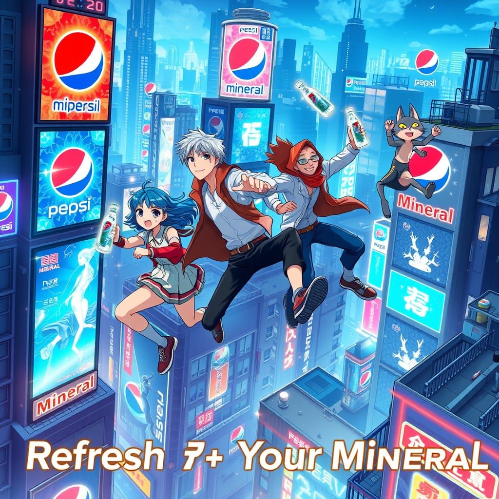 This image shows anime characters in a neon city, performing parkour while grabbing Pepsi Mineral. The scene features dynamic action, vivid colors, and sparkling energy, in a style reminiscent of anime commercials.