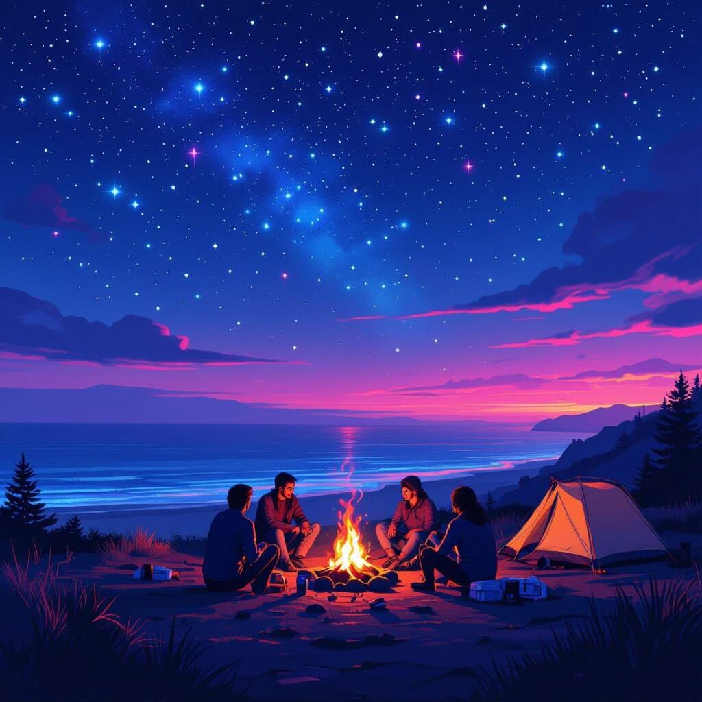 Create unique starry night images with friends singing by the campfire. Easy and free AI generation.