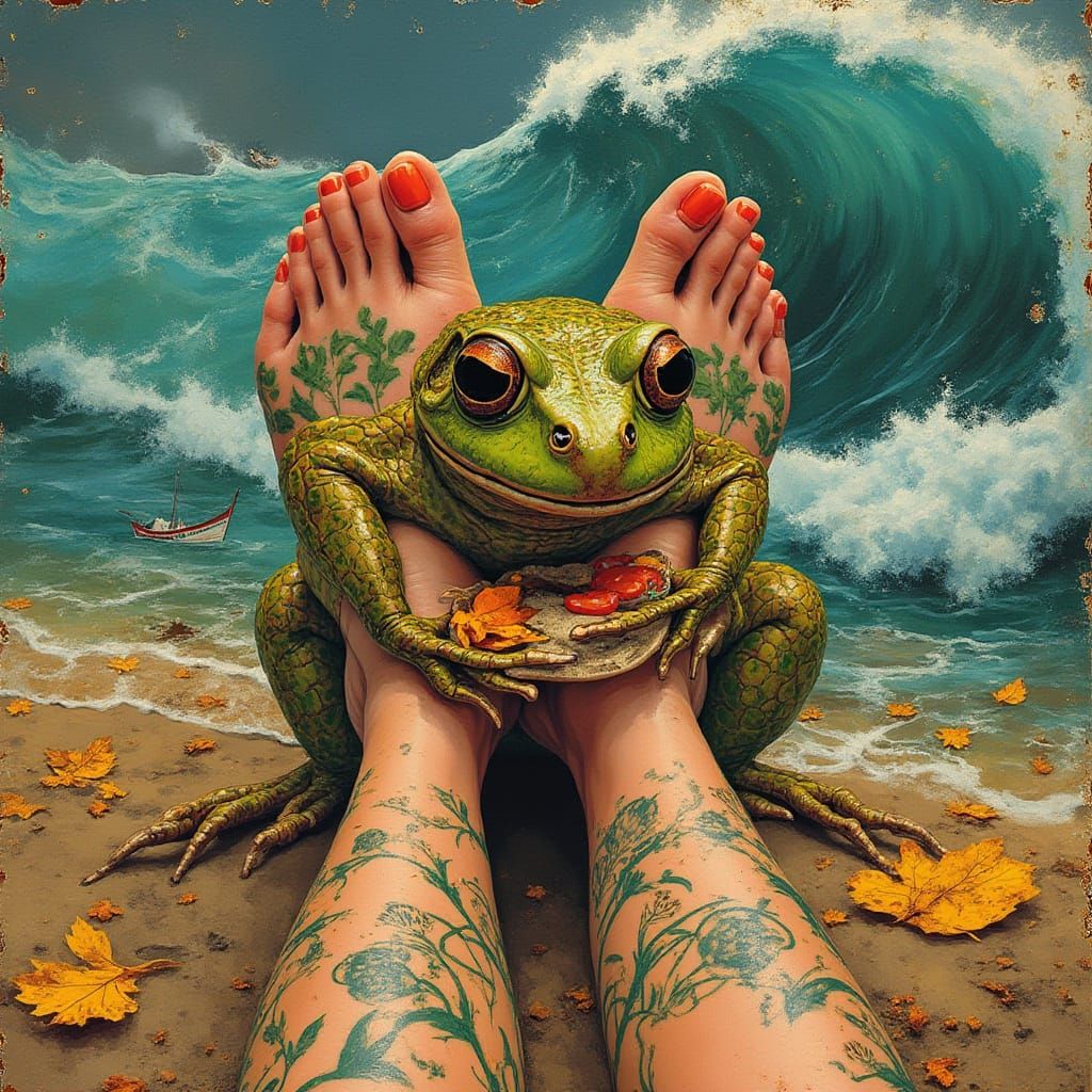 This image presents a unique art deco splash art composition featuring feet adorned with jewelry and tattoos on a textured soil. It includes a giant toad and a rat with a cat.