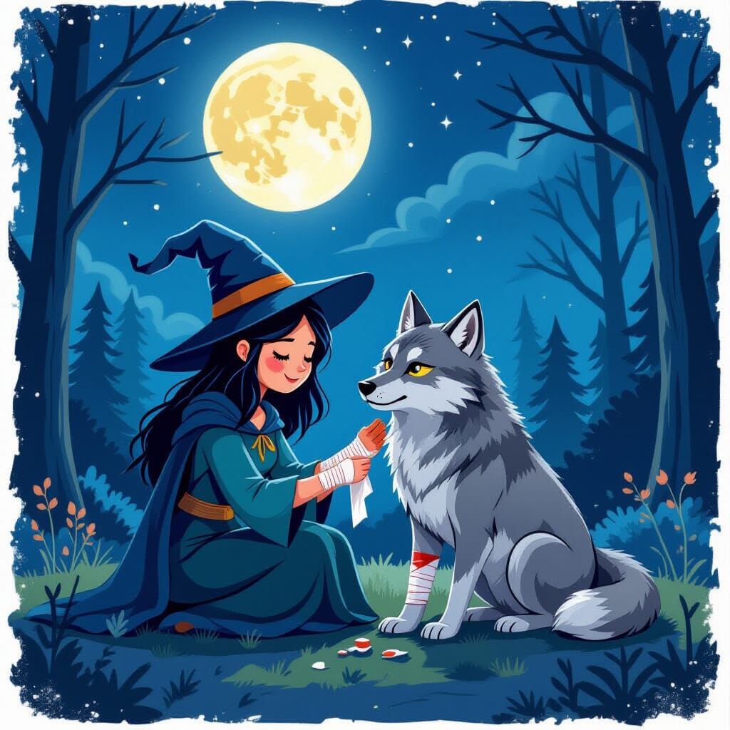 This image shows a gentle witch caring for an injured wolf beneath a bright full moon. The scene evokes a sense of magic and compassion in a nocturnal setting.