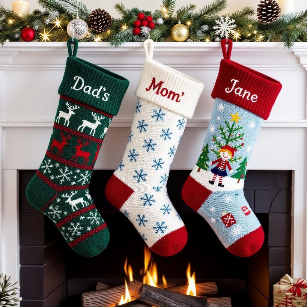 This image shows three Christmas stockings hanging above a fireplace, each with a unique design. The festive scene evokes feelings of family, magic, and cozy memories in a vintage oil painting style.