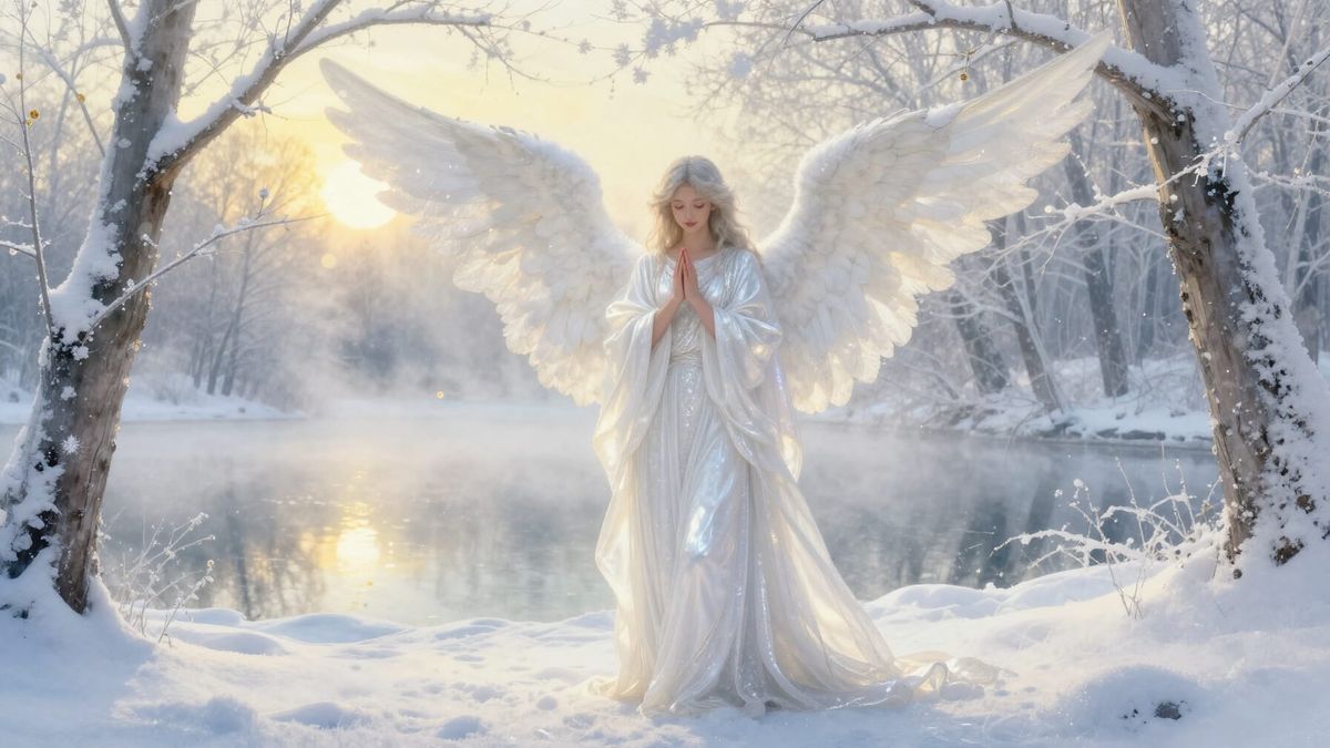 A beautiful white angel in prayer stands in a tranquil, snowy forest. This ethereal watercolor artwork features a cold winter palette and soft mist, creating a melancholic yet sparkling atmosphere.