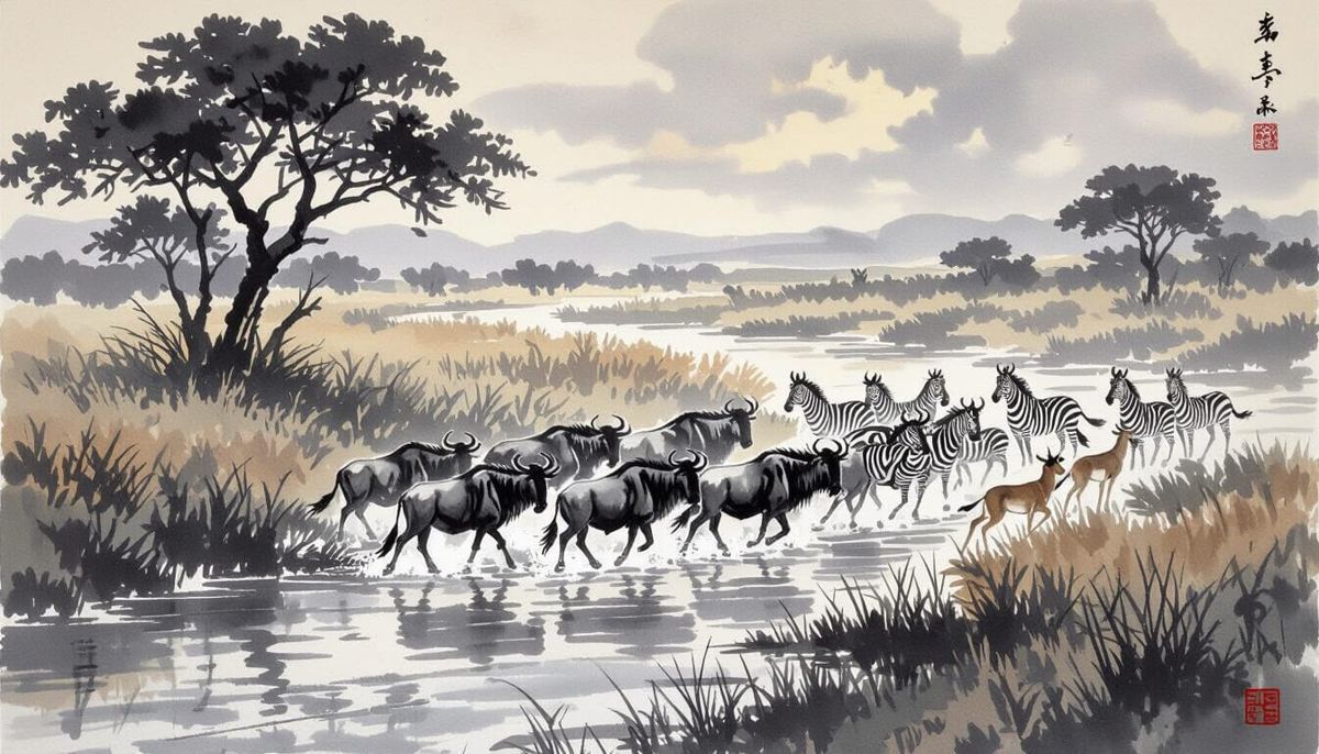 This image shows thousands of wildebeest, zebras and gazelles crossing the Mara River during migration. The artwork is reminiscent of a traditional Chinese ink wash painting.