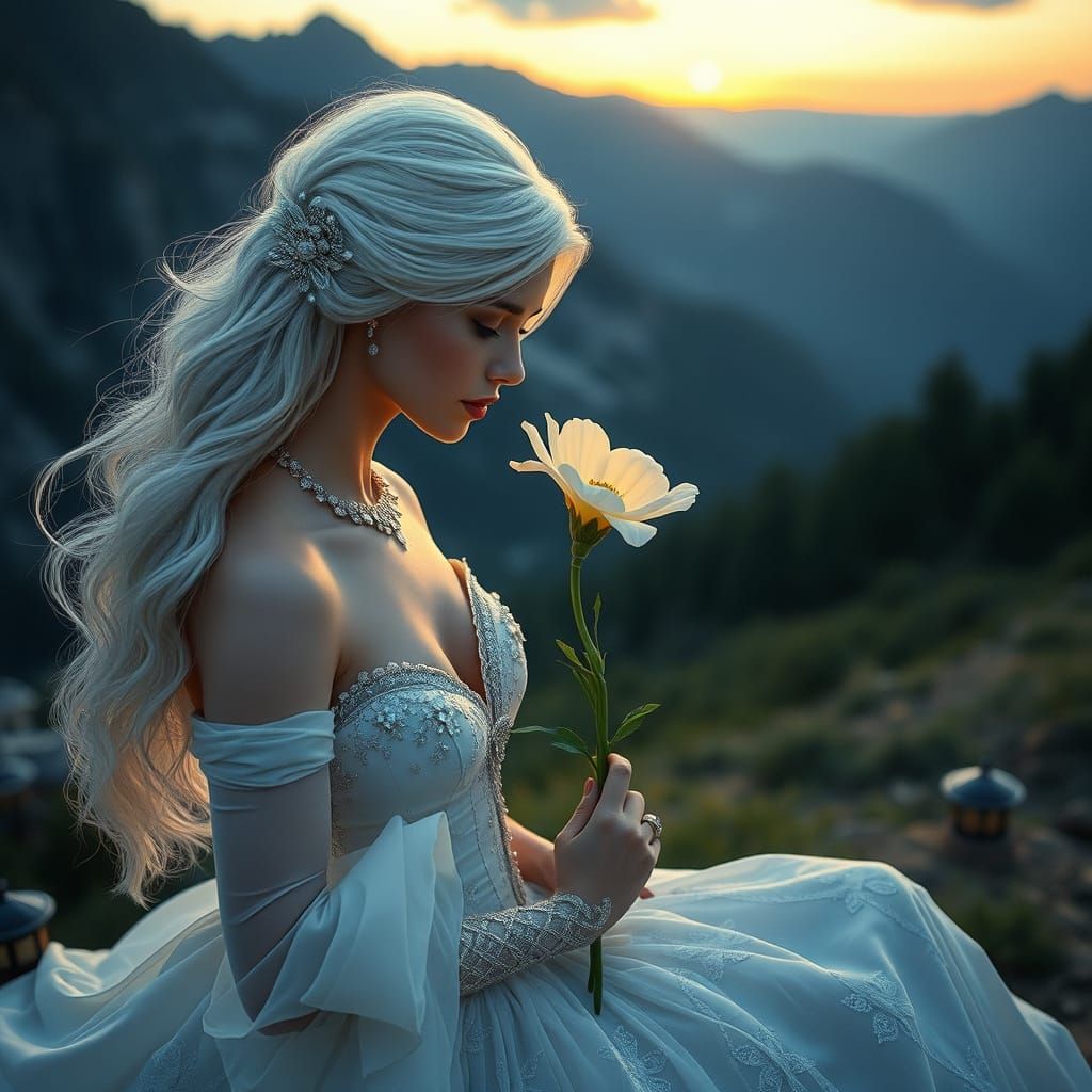 A striking picture of an albino woman with curly hair in an elaborate gown, holding a flower at sunrise. The background features hyperdetailed wire art with dynamic lighting and triadic colors. Rendered in Unreal Engine 5.