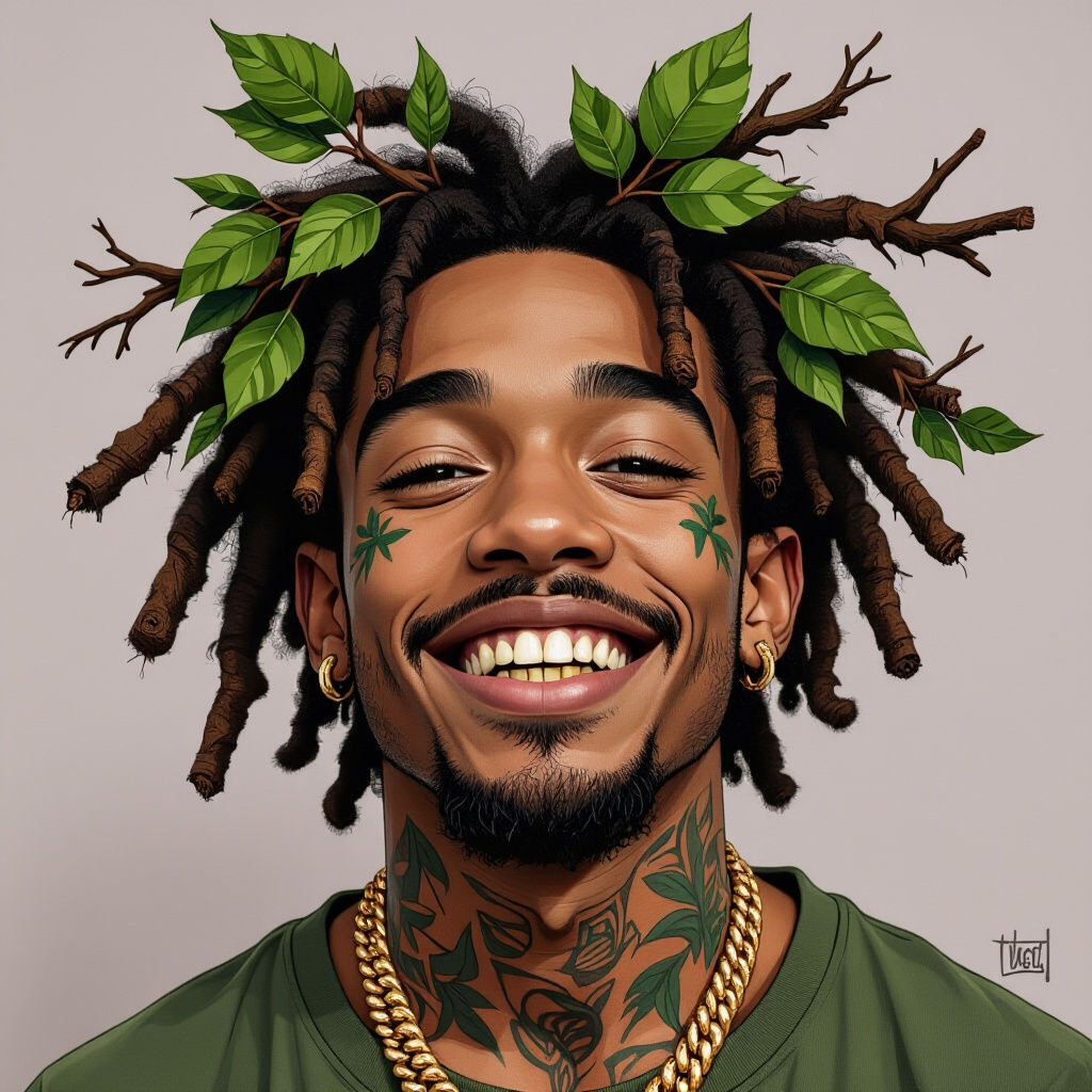 A portrait of a smiling hip-hop artist with gold teeth and tattoos. He has leaf-like dreadlocks and a subtle green skin tone, appearing as a genetically engineered plant-human hybrid.