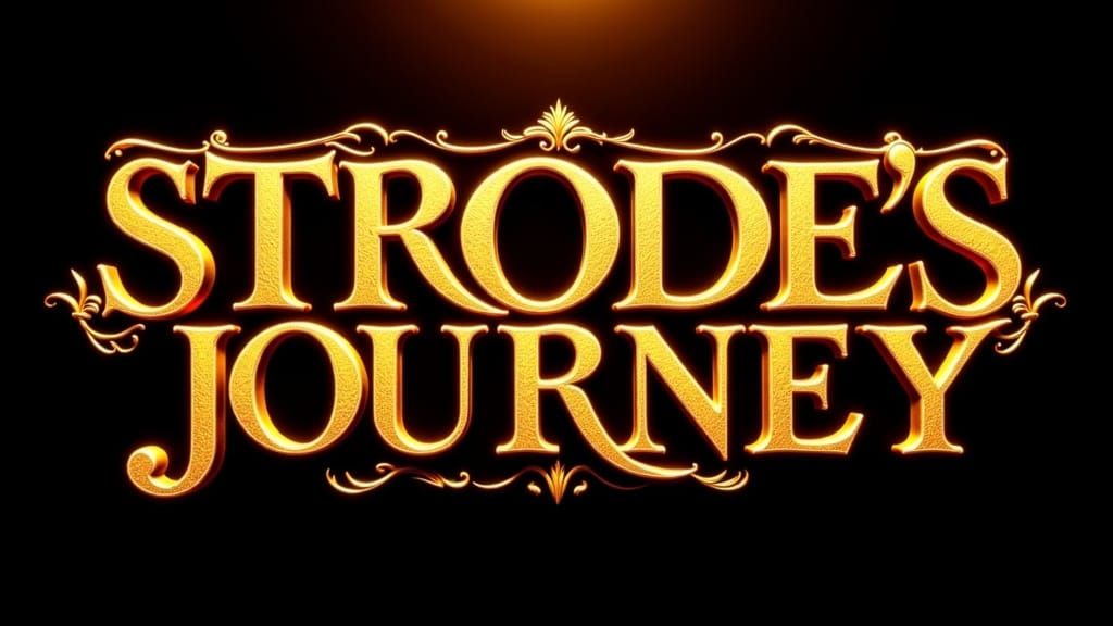 This image shows golden letters spelling 'STRODE'S JOURNEY', illuminated by a warm glow. The textures and shading evoke a futuristic and slightly dystopian digital art style.