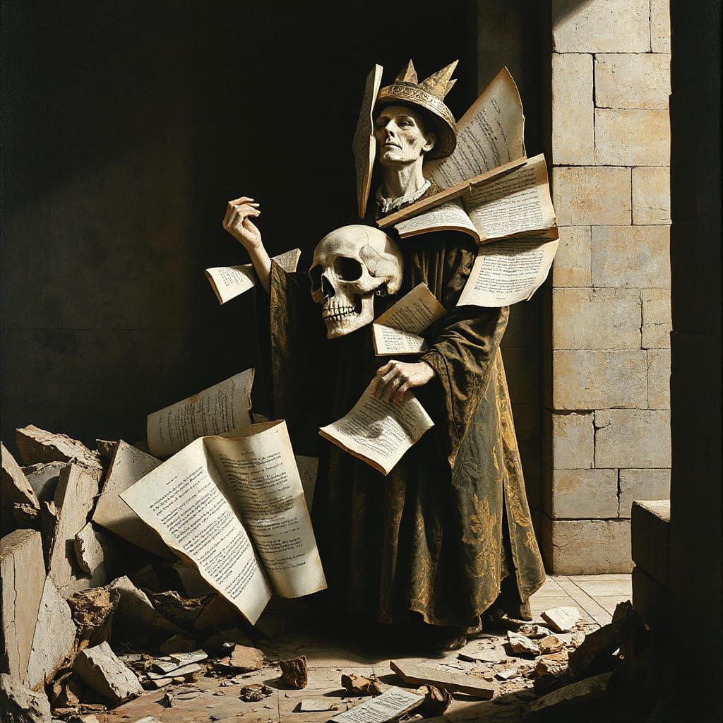 This image shows a figure representing "Morte Lenta" breaking silence with poems amid ruins. Rendered in an abstract cubist style with geometric forms and a somber palette.