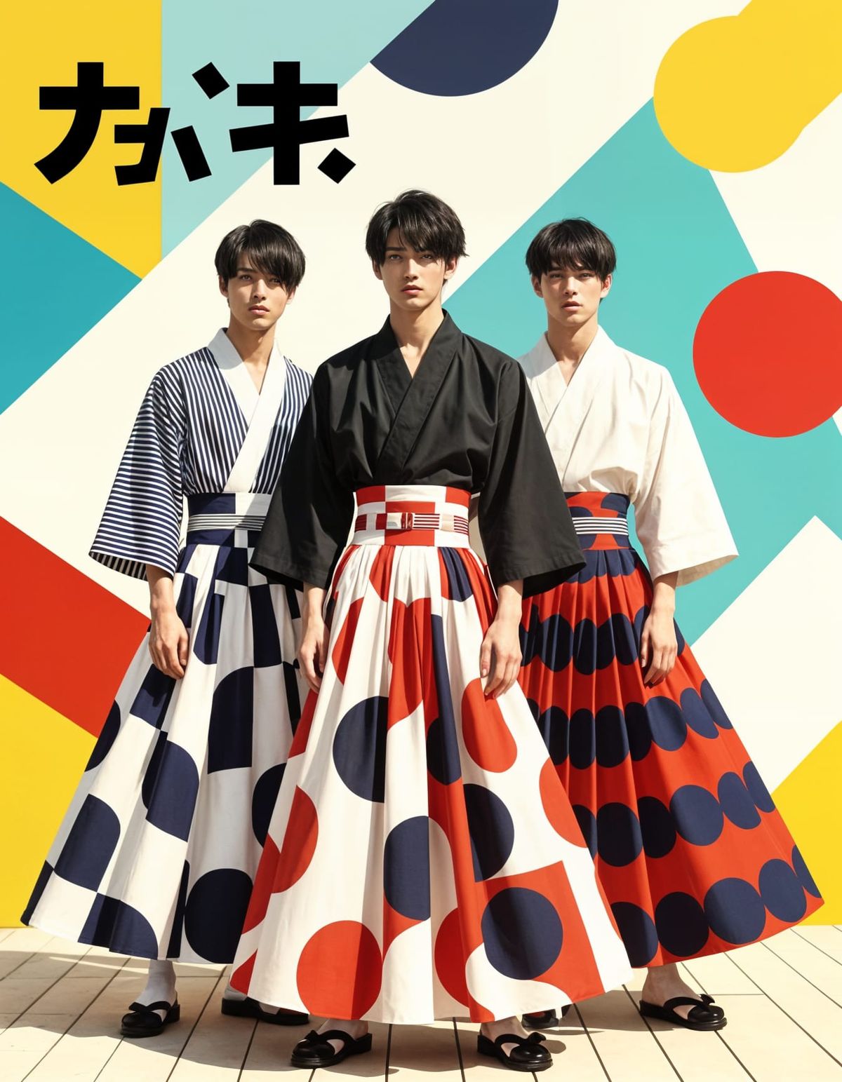 This image shows a Japanese fashion magazine cover featuring three young men modeling maxi skirts. The striking design incorporates a conceptual font and geometric background in a modern aesthetic.