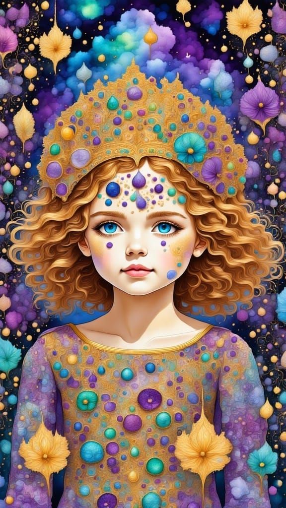 This image shows a close-up of a happy, pretty little girl in a fantasy world, surrounded by intricate details and patterns in a whimsical paisley aesthetic.