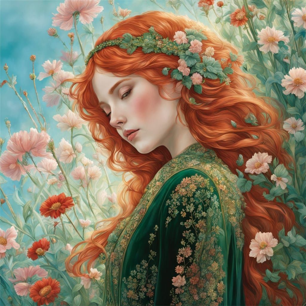 This image shows a close-up portrait of a girl with bright emerald-green eyes and vibrant red hair, surrounded by delicate wildflowers in pastel shades, set against a warm golden light with intricate textures and luminous colors.