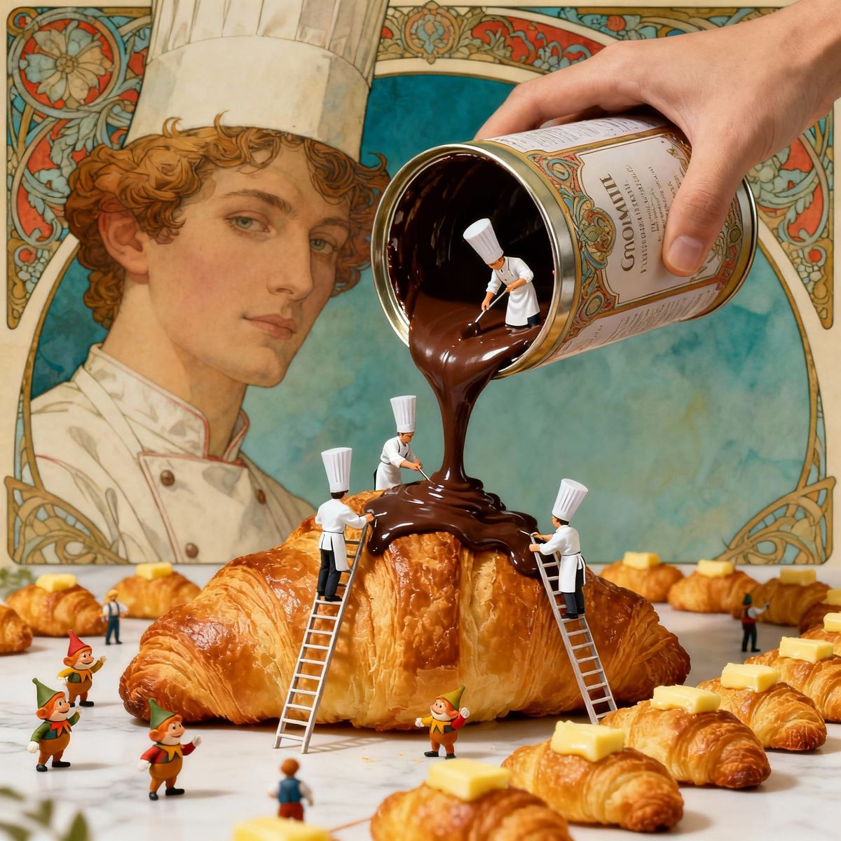 This image shows tiny figures meticulously decorating croissants with chocolate. Realistic photography captures the detailed scene of miniature chefs at work.