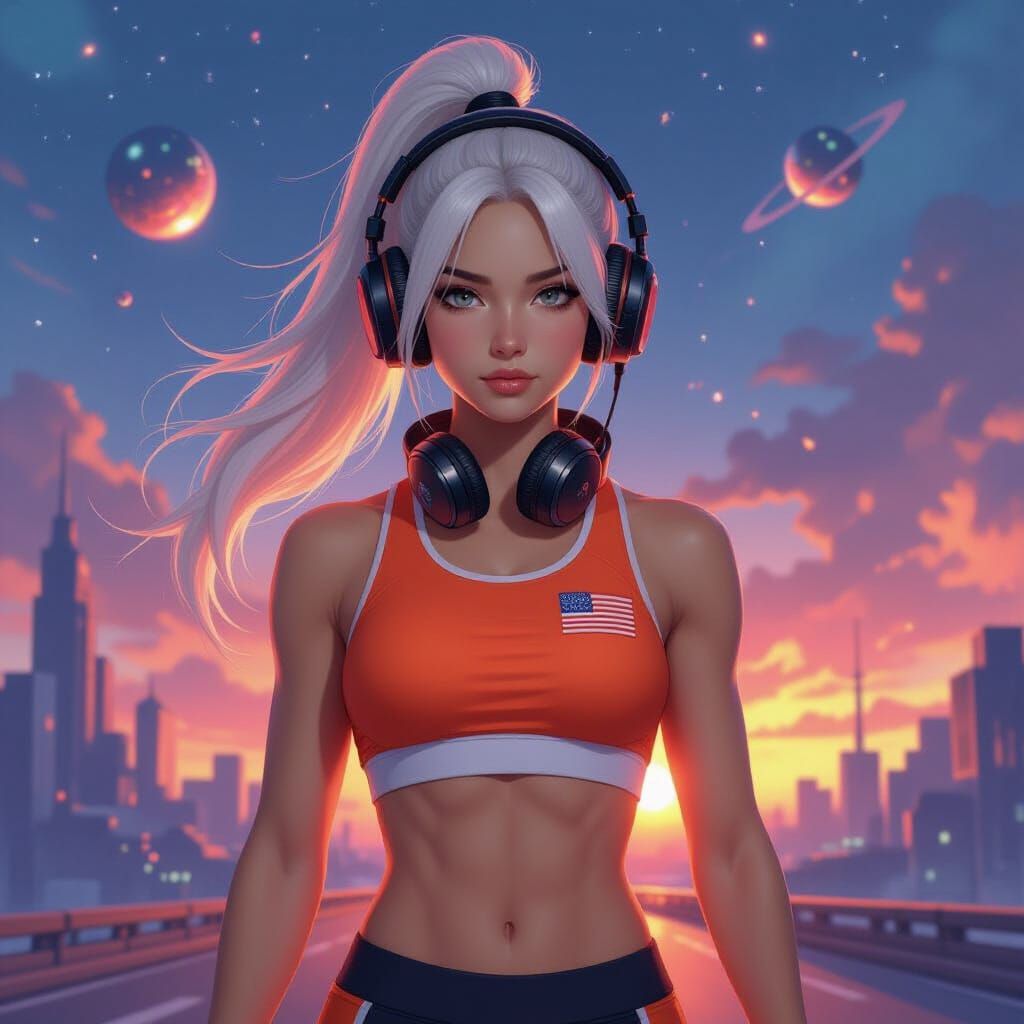 This image shows an astronaut girl with white hair against a hyperrealistic space background. She wears an athletic outfit with an American flag patch, headphones, and is rendered as 3D anime art.