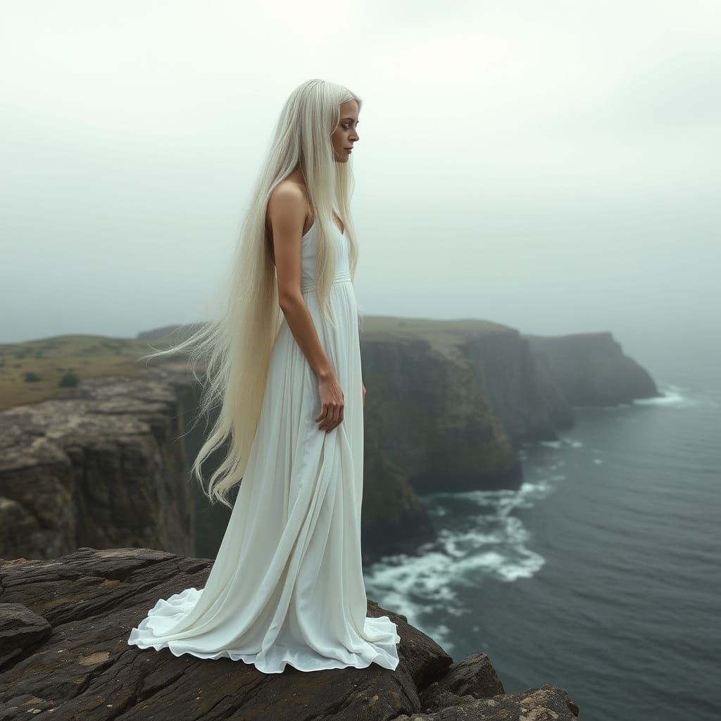 A sorrowful woman with white hair stands on a cliff, tears forming a river toward the coast. The image evokes melancholic surrealism with elements of digital art.