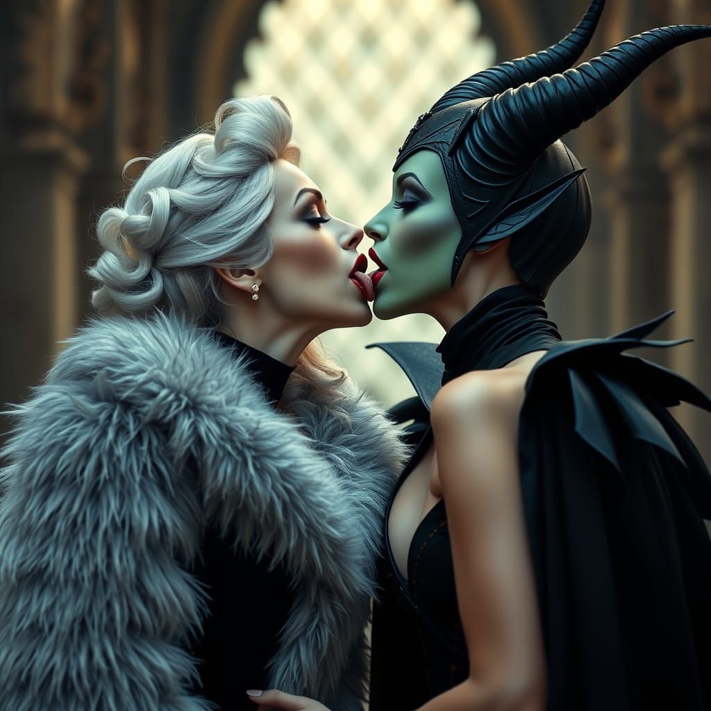 A striking picture of Cruella de Vil and Maleficent sharing a passionate kiss. The photo is realistic with intricate details, reminiscent of high-fashion photography.