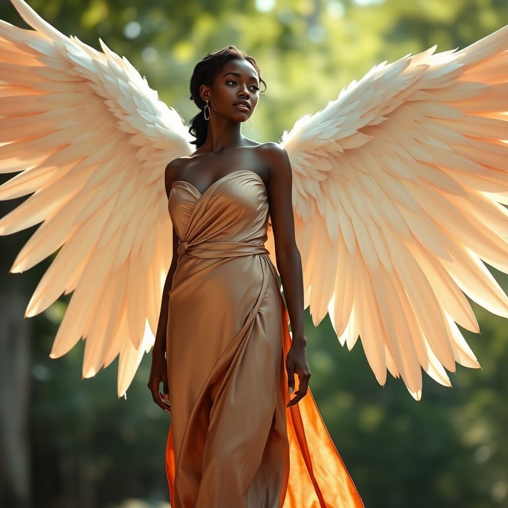 A striking picture of a beautiful, petite African-Asian woman with large angelic wings, standing in soft light. The image blends realism with dreamy, romantic elements in an ethereal style.