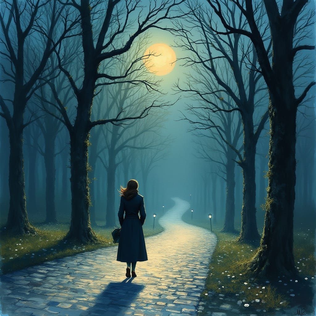 A lone figure walks through a moonlit garden, illuminated by hidden lamps and casting long shadows. Impressionistic style with delicate watercolor brushstrokes and muted blues, greens, and purples.