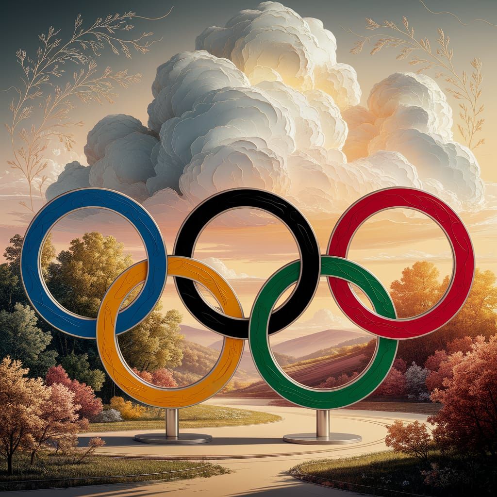 This artwork features layered Olympic rings with mixed media textures and scribbles, set against a luminous encaustic cloudscape of an Olympic Park. Rendered with impasto details and post-impressionist color.