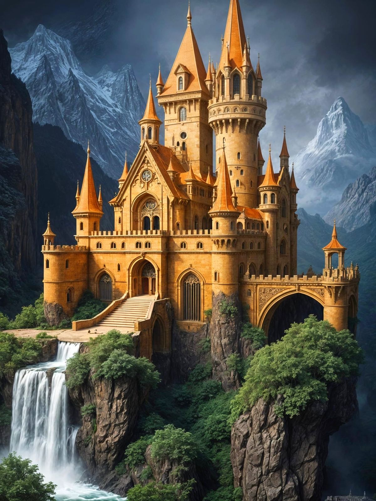 An intricate detailed medieval silver orange fantasy castle built on a huge bridge over epic waterfalls, a very intricate and hyper-detailed oil painting by Daniel F Gerhartz, Clint Cearley, Eve Ventrue, volumetric lighting, gorgeous, swirling ornamentals, elegant contrast, photorealistic, a masterpiece, ...