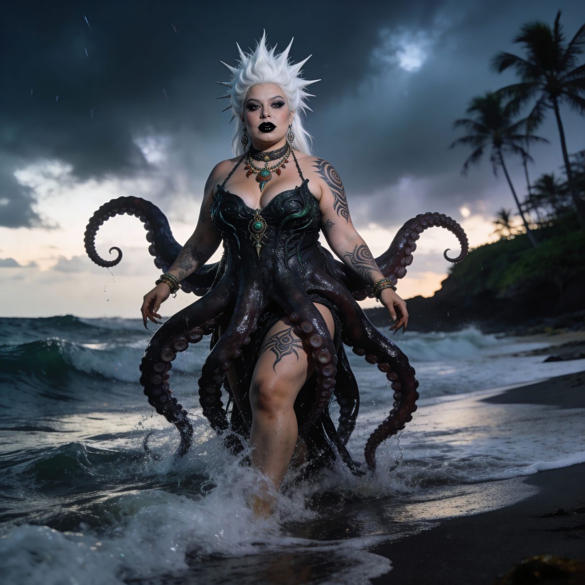 This image shows a hyperreal fantasy depiction of a curvy sea witch, resembling Ursula, with octopus-like tentacles and tribal tattoos emerging from the ocean onto a pacific island shore during twilight.