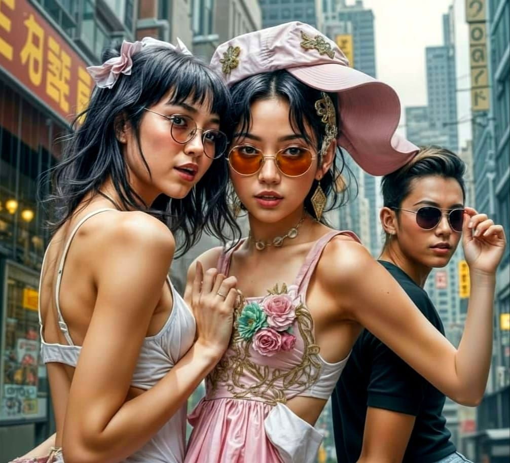 k-pop teens in town for a concert. The three of them the two girls and the boy are dancing in the street in the style of Wednesday Addams