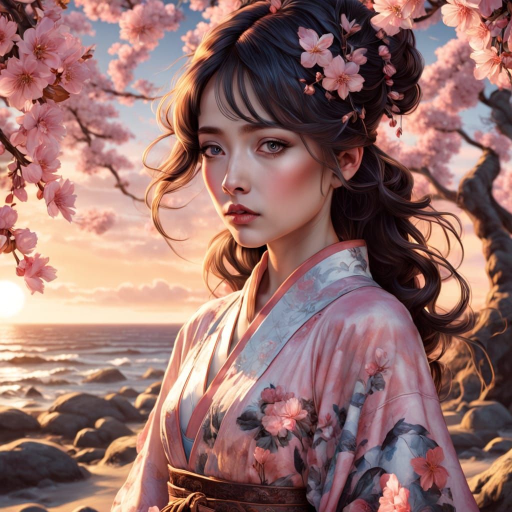 A striking portrait of a Japanese princess on a sunset beach. Cherry blossoms frame the scene, illuminated by golden light in a dark fantasy aesthetic. This illustration is highly detailed with warm colors.