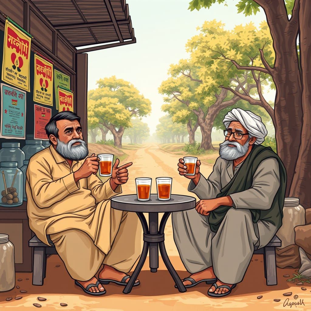 This image captures the warmth and simplicity of rural Bangladesh, with two men enjoying tea at a small roadside stall amidst vibrant posters and rustic textures, created in a whimsical cartoon style reminiscent of expressive illustration and warm, friendly atmosphere.