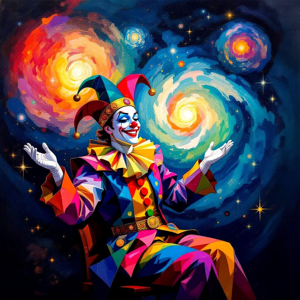 This abstract artwork depicts a jester's club with cosmic energy and celestial patterns. It features energetic strokes, luminous colors, and swirling galaxies in a dynamic composition.